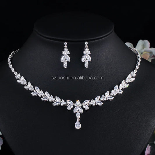 Delicate 2pcs Leaf Shaped Cubic Zircon Dubai Yellow Gold Plated Jewelry Sets Drop Earrings Necklace Women Luxury Bridal Wedding