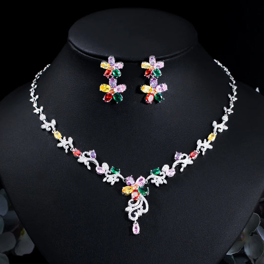 Exclusive Shiny Multi Color Flower Cubic Zircon Elegant Engagement Wedding Bridal Jewelry Set for Women CZ Necklace and Earrings